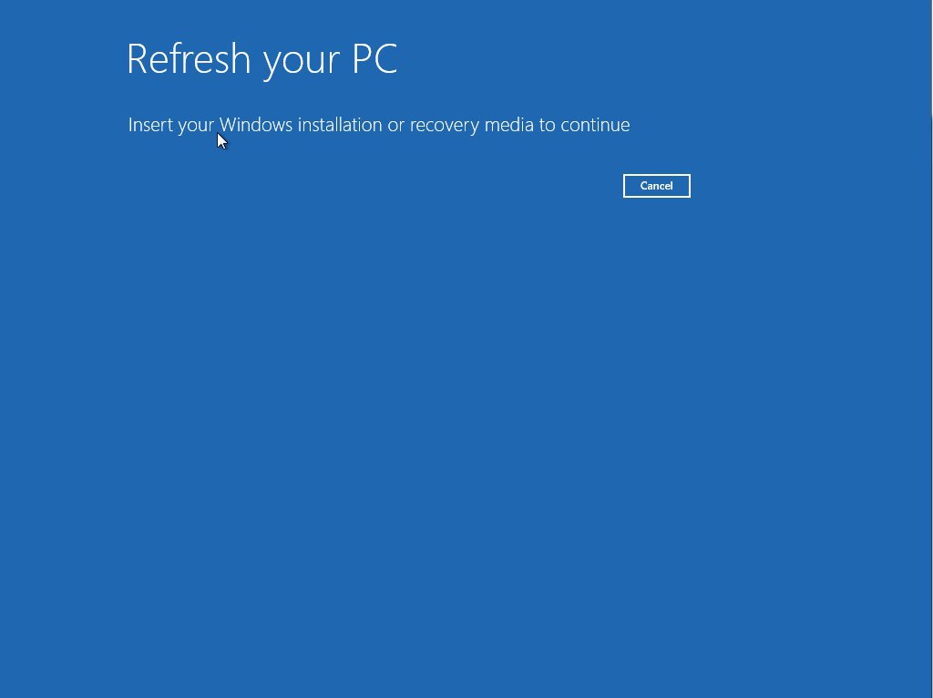 Otherwise, Windows 8 will use your installation media when you refresh your PC. Boot to the System Recovery Options using your Windows 8 installation DVD or USB thumb If prompted to Insert media, insert or connect your Windows installation DVD or USB, ... View Doc